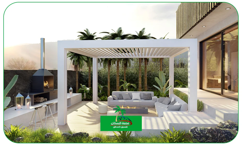 • هياكل الظل: البرجولات والمظلات القابلة للسحب تعتبر ضرورية في مناخنا لتوفير مناطق جلوس محمية من الشمس.